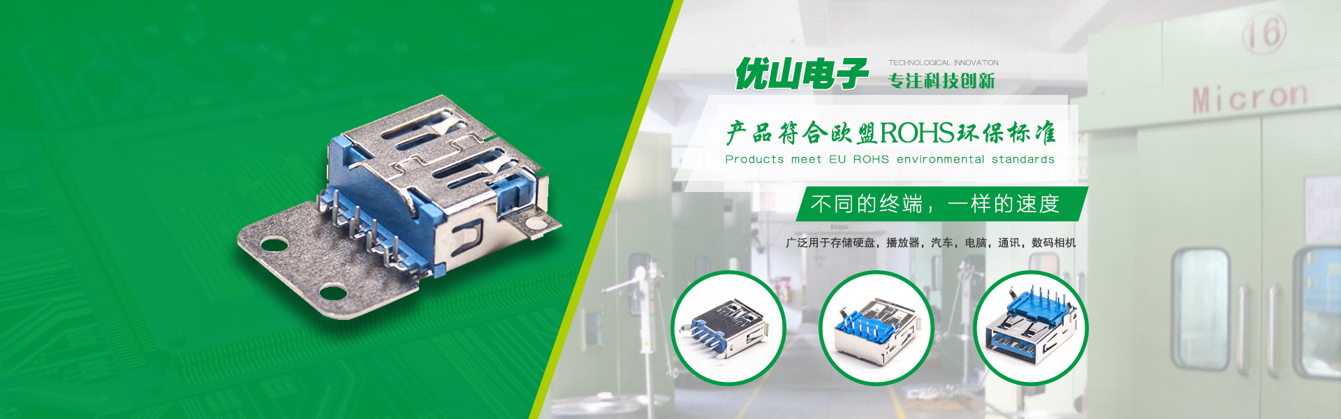 東莞市優山電子科技有限公司成立于2005年10月,是一家專業從事連接器、連接線開發、生產、銷售的獨資企業(東莞USB3.0插口,3.0USB廠家,Micro3.0USB插口,USB3.0接口生產廠,國內USB連接器廠),產品符合歐盟ROHS環保標準,廣泛用于存儲硬盤,播放器,汽車,電腦,通訊,數碼相機等。